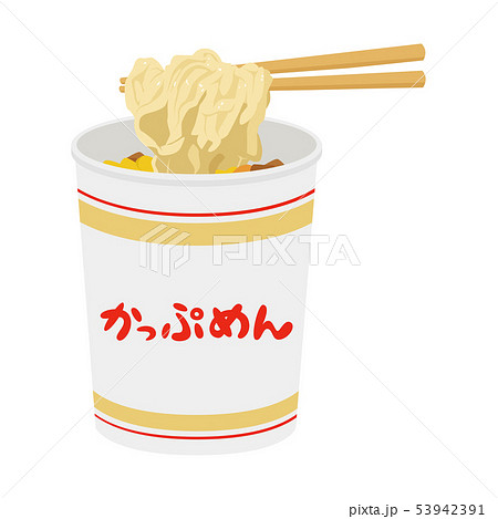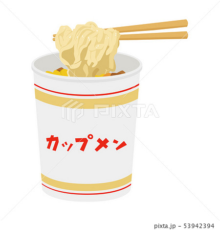 カップ麺のイラスト。コンビニで売ってるインスタントラーメン。箸で麺を食べる。