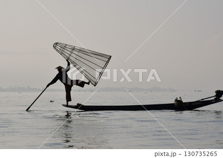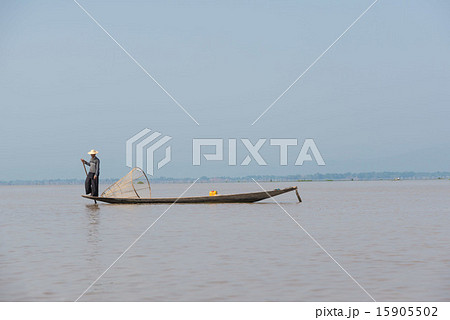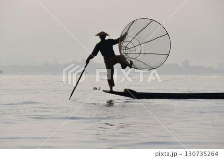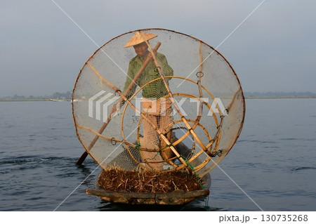 ミャンマー、インレー湖、インター族の漁師、魚とりの網、片足漕ぎ、小舟