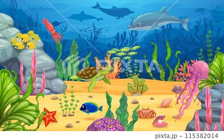 Underwater game landscape, cartoon sea animals. Turtle, jellyfish octopus and stingray, crab and fishes between algae seaweeds. Vector coral reefs and vibrant marine life level, interface background
