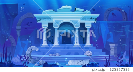 Underwater temple. Sunken ancient palace on ocean bottom, lost atlantis city under sea water deep world cartoon game ui background marine ruin landscape, swanky vector illustration