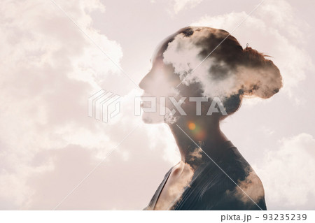 Atmosphere pressure and woman mental health contemplation concept. Multiple exposure clouds and sun on female head silhouette.