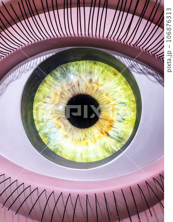 Medical mannequin. Close-up of a human eye with clear lines of the retina, lens and eyelashes. Anatomical model of a human organ. Eyelashes, skin and cornea of the eye are well detailed. Eyeball