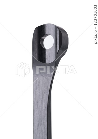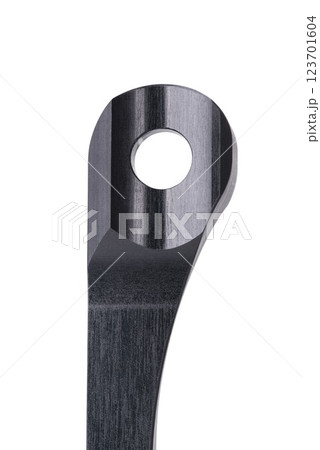 Close up, front site of a graphite bicycle Road Chain catcher isolated on white background floating above the ground.