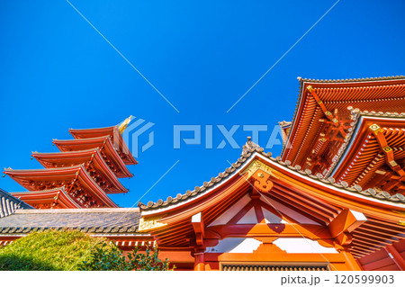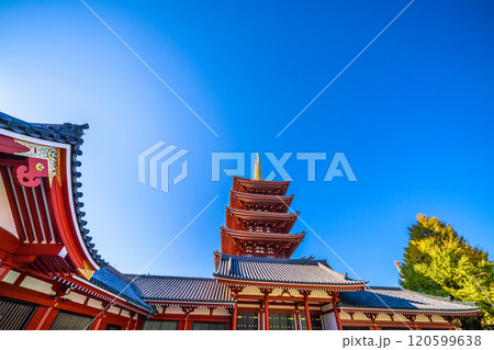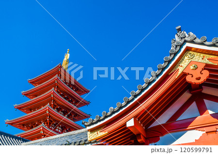 日本の東京都市景観 航空機…青空が広がる東京。浅草寺の五重塔や宝蔵門などを望む。新時代へ=25日