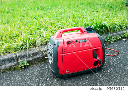 赤い携帯発電機と緑色の芝生