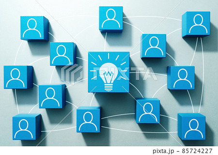 オンライン上でアイディアを出し合ったり、共有したりするイメージ。人のアイコンが描かれた多数のブロック