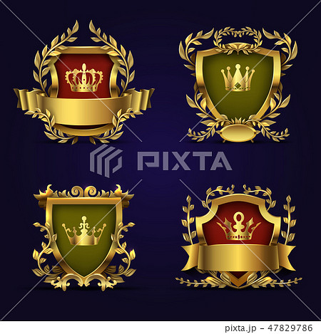 Royal heraldic vector emblems in victorian style with golden crown, shield and laurel wreath