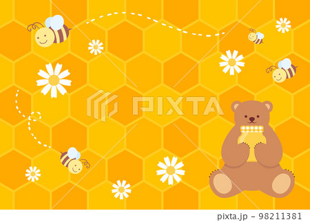 はちみつを持ったくま、みつばち、花、蜂の巣の背景イラスト