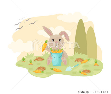 Cute rabbit. An image of a cartoon rabbit with a bucket of carrots. Rabbit collects carrots in the garden. Autumn illustration. Vector
