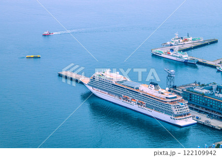日本の横浜都市景観 初入港。新港ふ頭客船ターミナルのバイキング・エデンや水上バスなどを望む=19日