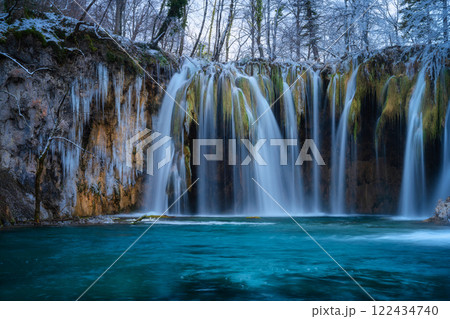 Winter waterfall, lake, frozen trees with icicles in cold evening
