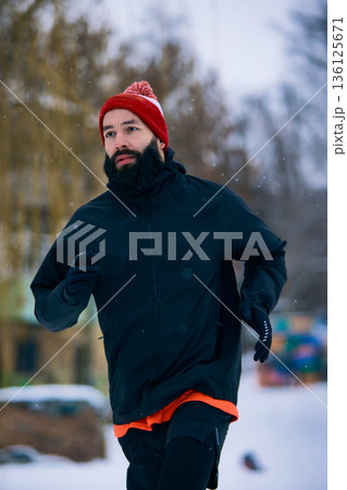Winter workout. Girl wearing sportswear, stretching exercises.