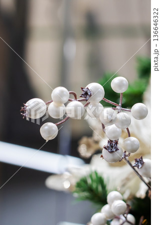 Frosted berries with soft background. Delicate berries on icy branch with subtle lighting
