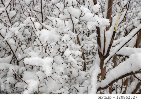 Tree branches in winter covered with snow and frost in snowfall. Frozen tree branches.