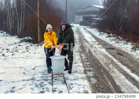 Use of sled for trash hauling in winter in rural area, man and woman in their 50s pull sled by rope.