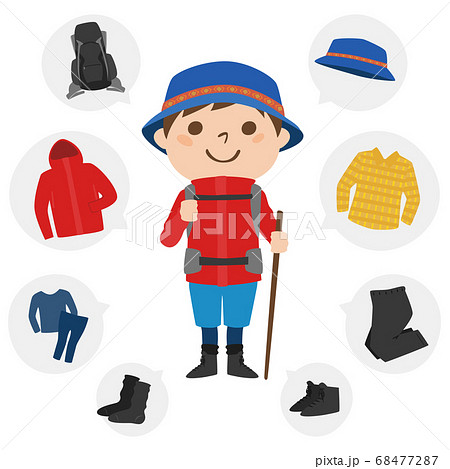 登山の服装を準備した男性のイラスト。ウィンドブレーカーなどの防寒ウェアも。