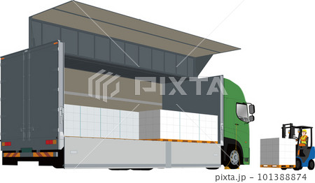 ウイングトラックとフォークリフトと荷物の積み込みのイラスト