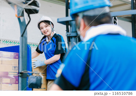 トラックにフォークリフトで荷物を積むヘルメット姿の作業員