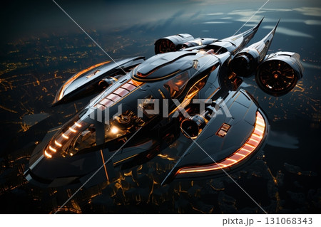 futuristic flying vehicle over the city, aerial view, cityscape, sky at sunset, aerial transportation of future