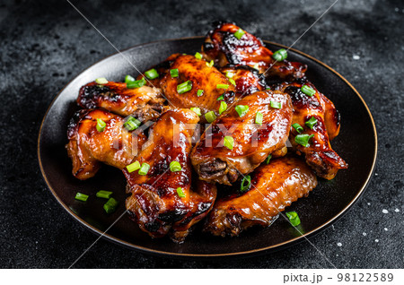 Baked chicken wings with sweet chili sauce in a plate. Black background. Top view