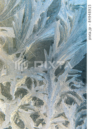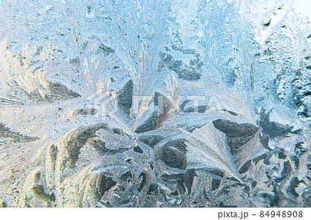 Frozen winter window with shiny ice frost pattern texture. Christmas wonder symbol, abstract background. Extreme north low temperature, natural Ice snow on frosty glass, cool winter weather outdoor.