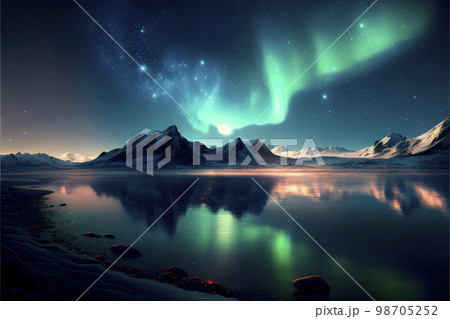 寒い北の国の美しい星空 オーロラ 湖 雪「AI生成画像」
