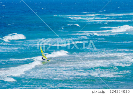 白波立つ夏の海でウインドサーフィンを楽しむ人物