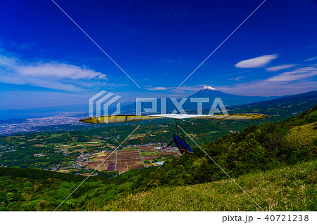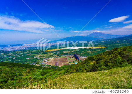(静岡県)丹那盆地上空を飛ぶハンググライダーと富士山