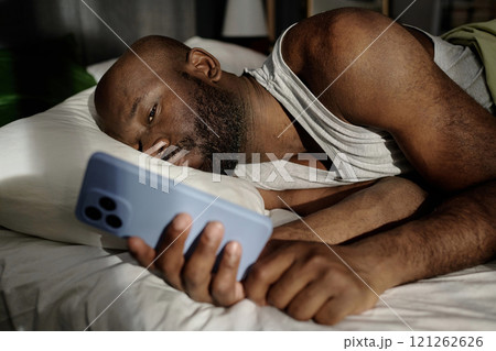 African American man lying on pillow looking at smartphones screen while checking social networks