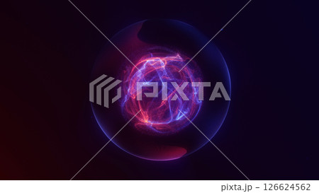 Vibrant fusion of red and blue plasma particles forming an energetic sphere core. Perfect for AI, data, crypto, music visualizations and futuristic tech concepts.