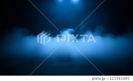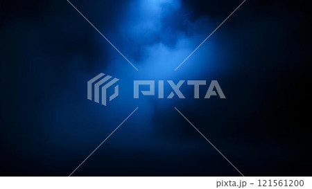 A beam of cold blue spotlight on a dark, empty stage, the room shrouded in a thick layer of blue fog. An abstract combination of smoke textures and lighting