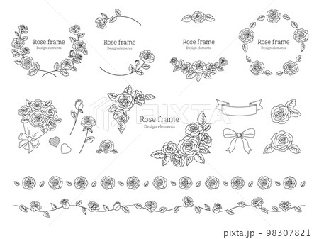 薔薇のベクターイラスト, フレームと装飾, バレンタインや結婚式, 白背景に黒色の線画.