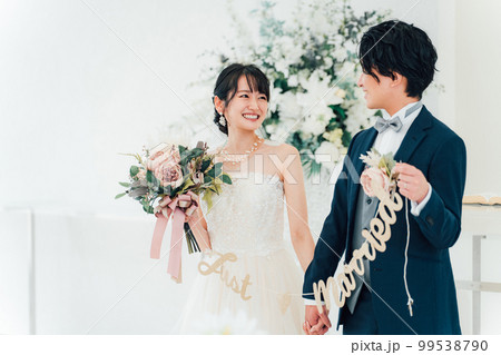 結婚式場でガーランドを持つ新郎新婦(ブライダル・ウェディング)