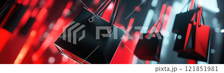 Futuristic Black Friday background with floating black and red shopping bags and ample space for promotional text