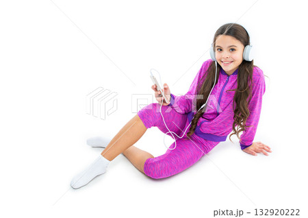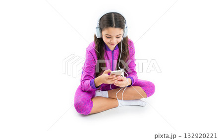 teen girl use music app sit isolated on white. teen girl use music app in studio.