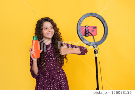 cheerful child with long curly hair making video for blog hold shampoo