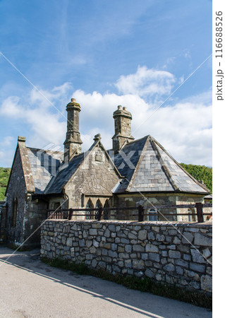 もこもこな雲が浮かぶ青空の下の緑に囲まれた歴史的な石造りの建物 南ウェールズの郊外にて