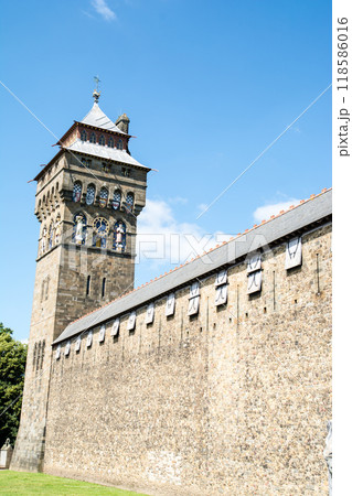 明る日差しの下の石造りの大きな歴史的な時計台 ウェールズの首都カーディフにて