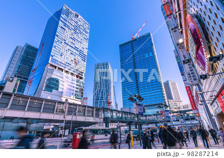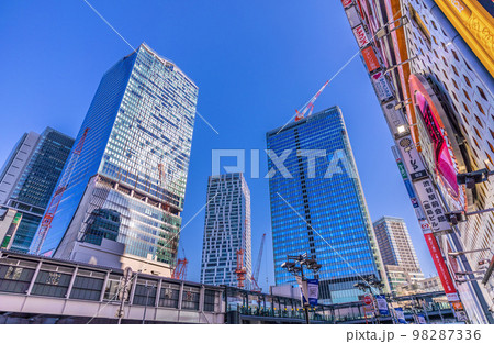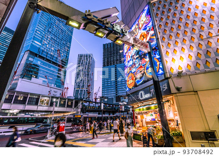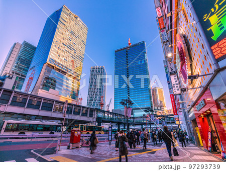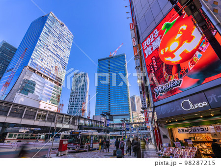 日本の東京都市景観 渋谷のウェーヴ通り(出入口)前から渋谷駅や桜丘口再開発などを望む=1月11日