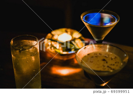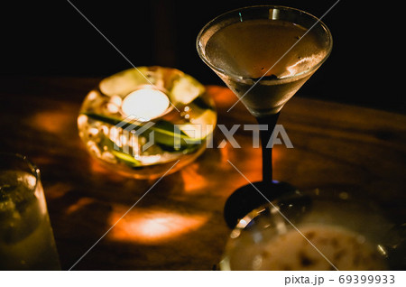 暗がりのバーでカクテル ロウソクの灯りで大人の時間