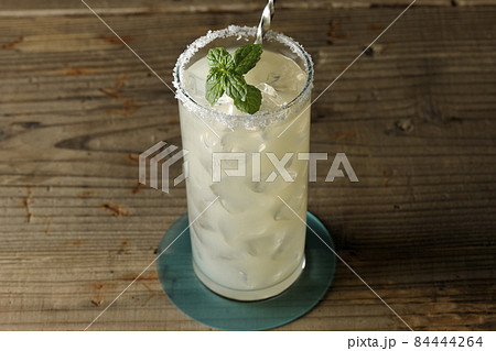 グラスの縁に塩が付いてるミント入りカクテルのソルティドッグ