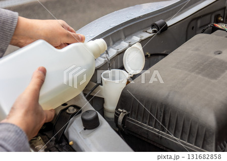 ウォッシャー液を注ぐ男性の手
