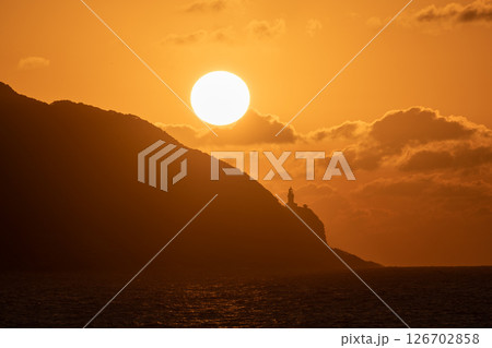 屋久島洋上アルプスの夕景(11月)沈む夕日と屋久島灯台