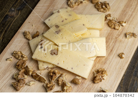 AI-generated content. Cheese mix on wooden plate still-life. Ai Generative.