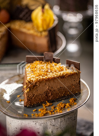 Sweet tasty tart with nuts and honey on a dark concrete background