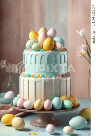 Homemade cake with frosting and colored sugar eggs for Easter.