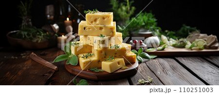 AI-generated content. Cheese mix on wooden plate still-life. Ai Generative.