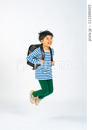 ランドセルを背負って笑顔でジャンプする小学生の男の子