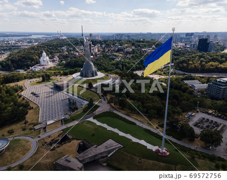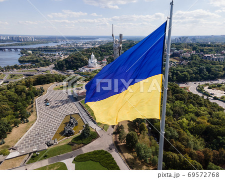 Kyiv - National flag of Ukraine. Aerial view. Kiev