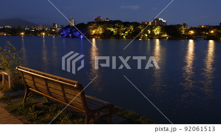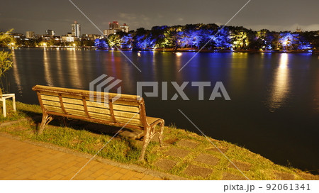 ロシアのウクライナ軍事侵攻に抗議してウクライナの国旗の色にライトアップされた大濠公園
